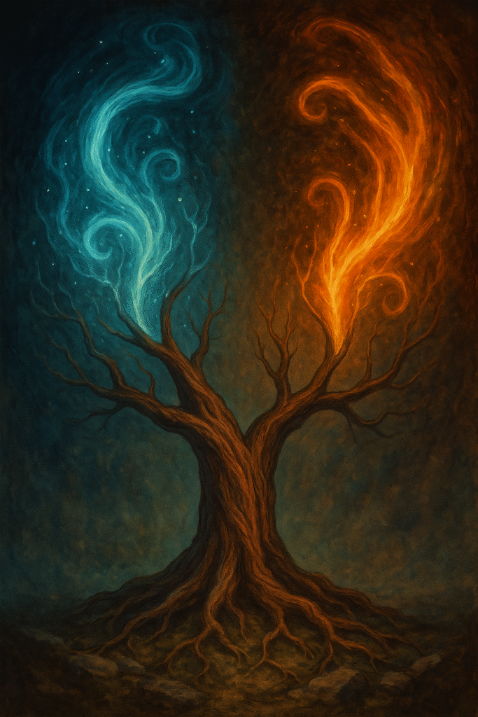Obie gałęzie mają wspólny początek, zakorzeniony głęboko w ziemi, lecz każda prowadzi w inną stronę.